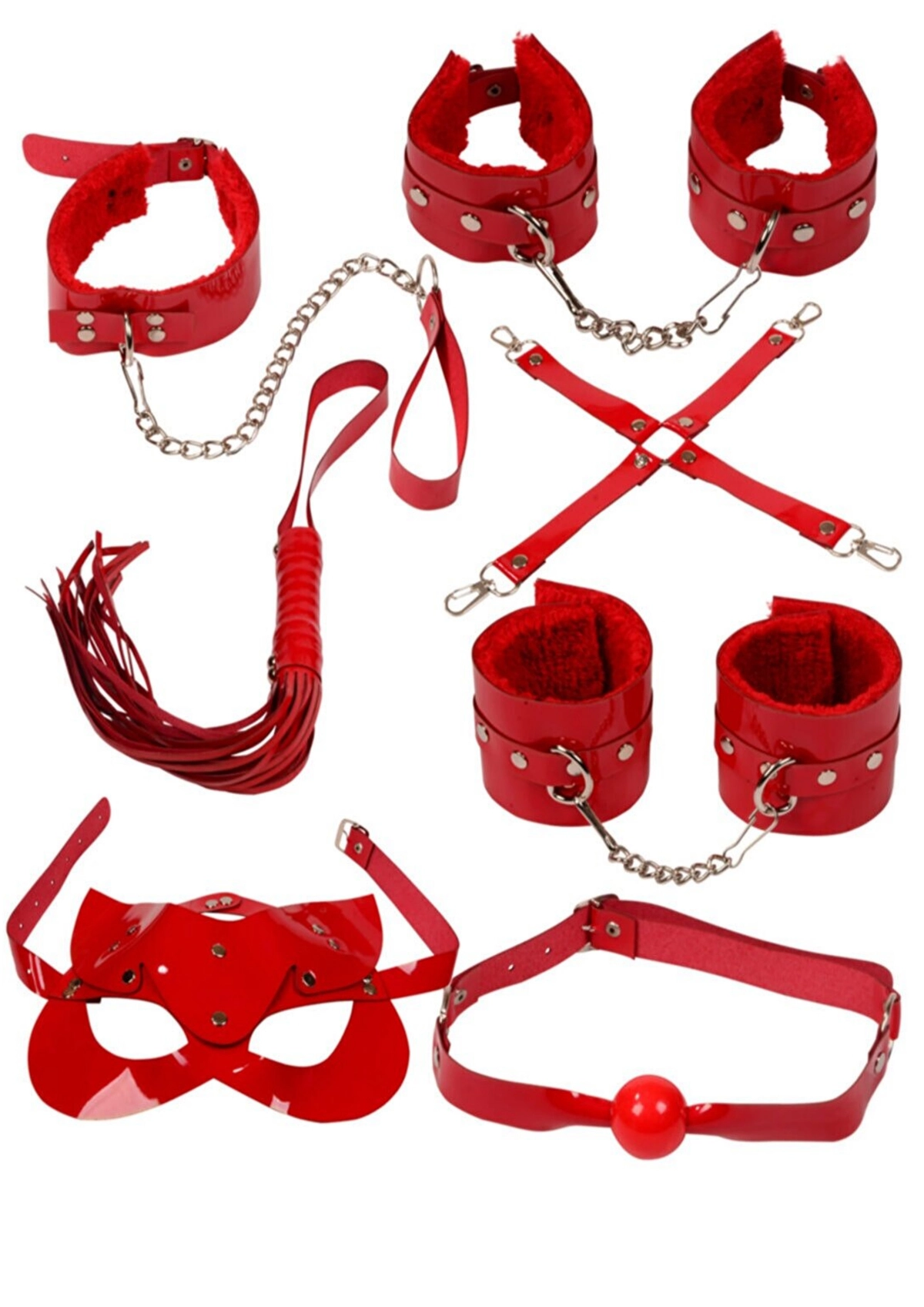 ExotiKiss Kırmızı Premium BDSM Fantezi Seti – Maske, Ağız Topu, Kelepçe, Kamçı ve Zincirli Bağlama Seti