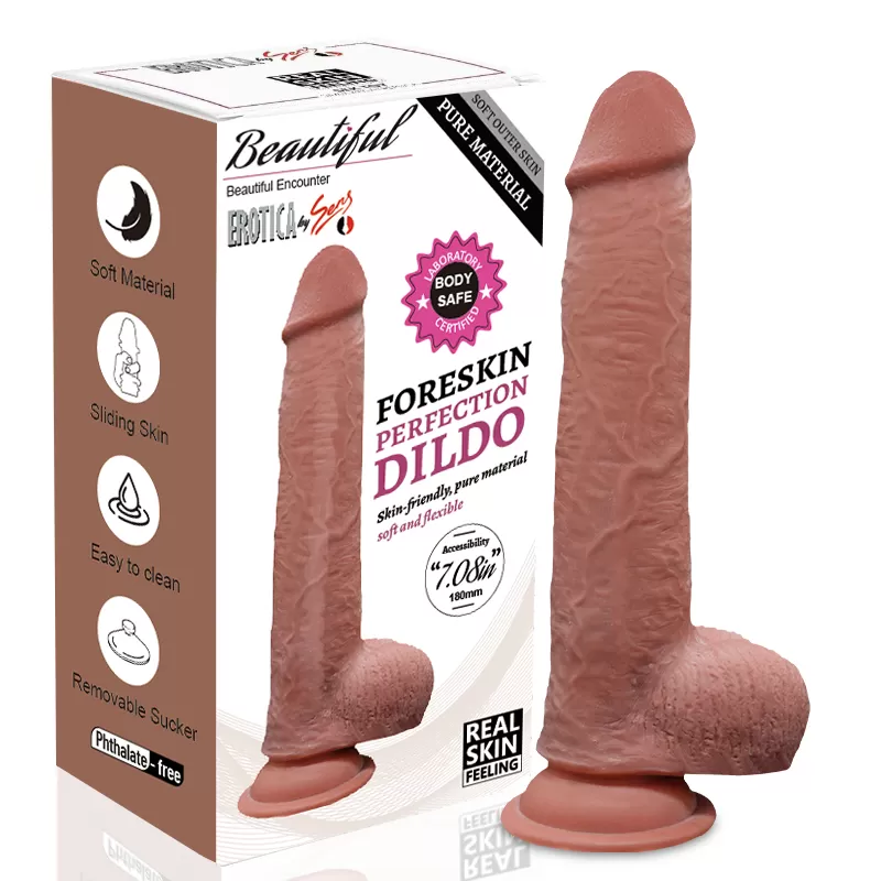Foreskin Perfection Dildo 22.5 cm, doğallık ve gerçeklik arayanlar için özel olarak tasarlanmış, el yapımı bir melez modeldir. Kayar derisi ve çift katmanlı dokusu sayesinde hissiyat, görünüm ve esneklik bakımından en üst seviyededir.