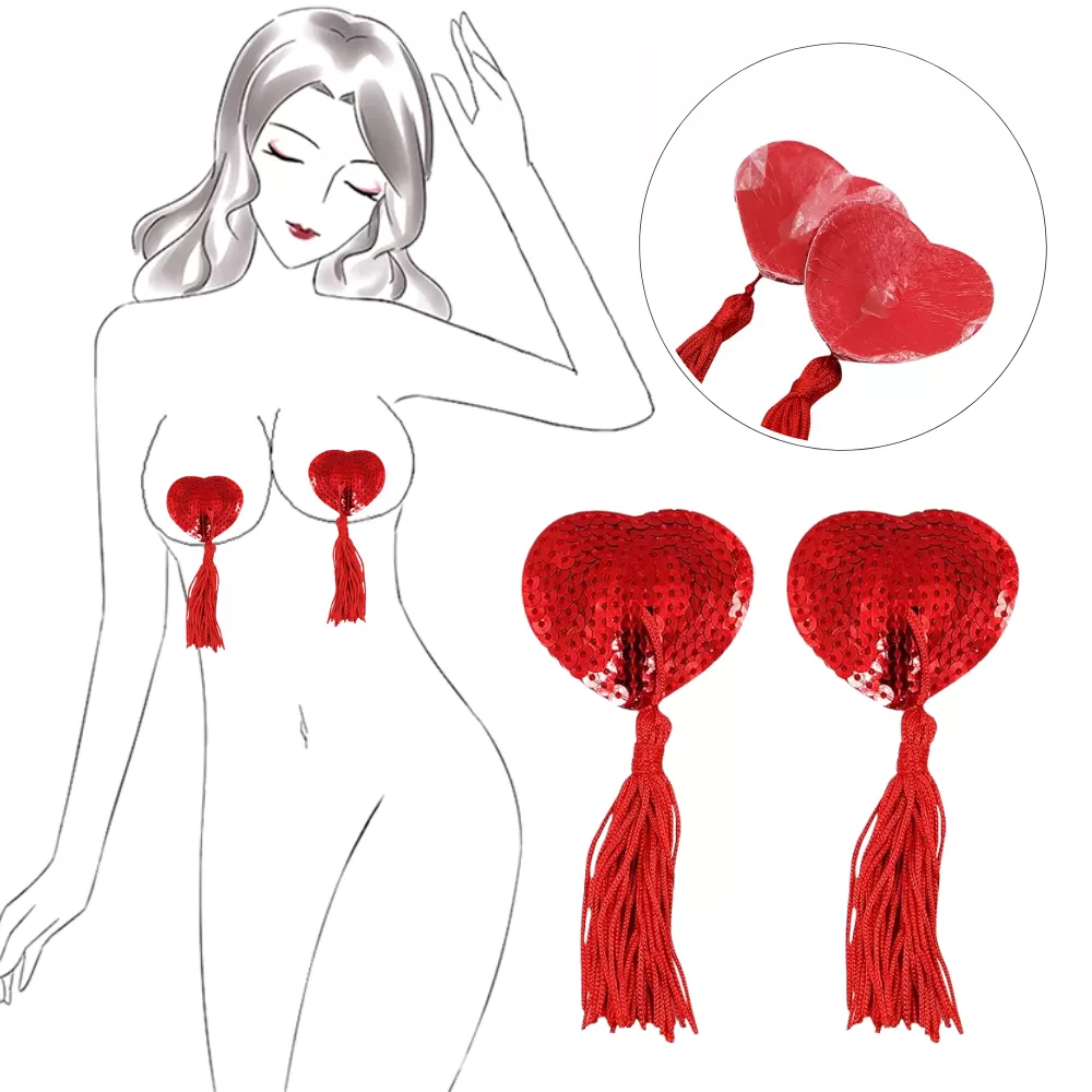 Gıdıklayıcı Püsküllü Yapışkanlı Kırmızı Parıltılı Kalp Şeklinde Meme Ucu Gizleyici Göğüs Aksesuarı