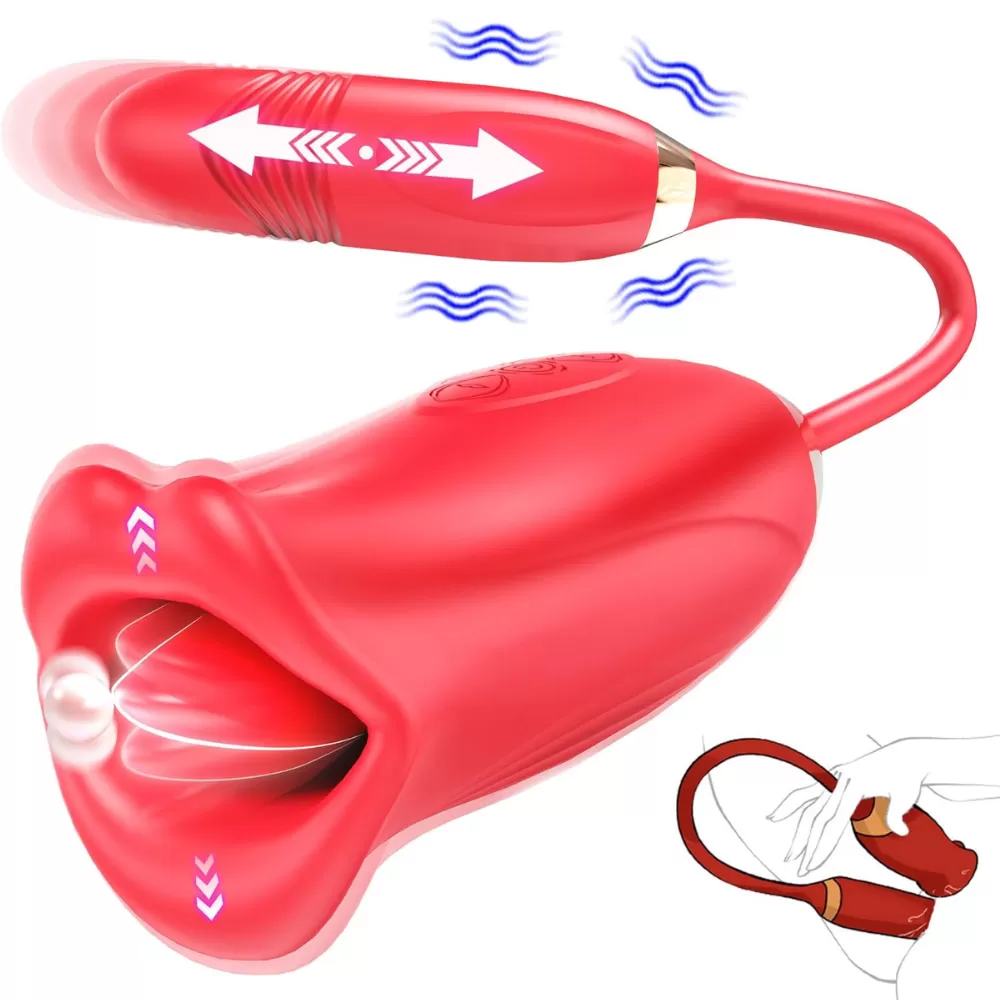 İleri geri hareketli yapay penisli 3'ü 1 arada oral seks vibrartörü, bu dudak hareketli dil vibratörü, aşağı yukarı 10 oral seks modu, 10 ileri geri hareketli mod ve 10 titreşim fonksiyonuyla birleştirilmiş 3'ü 1 arada gül oyuncağıdır.